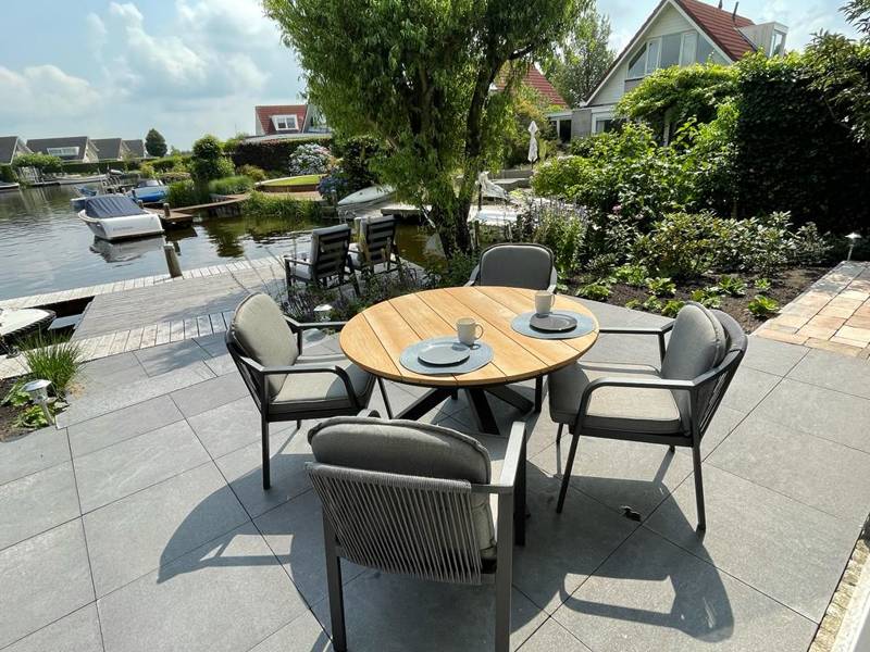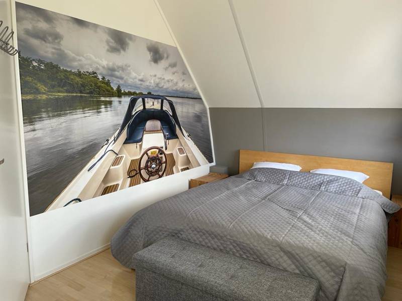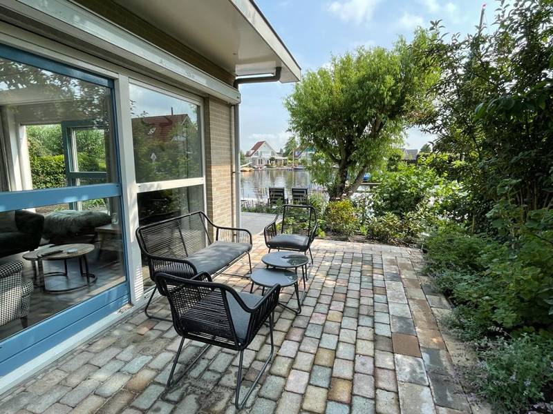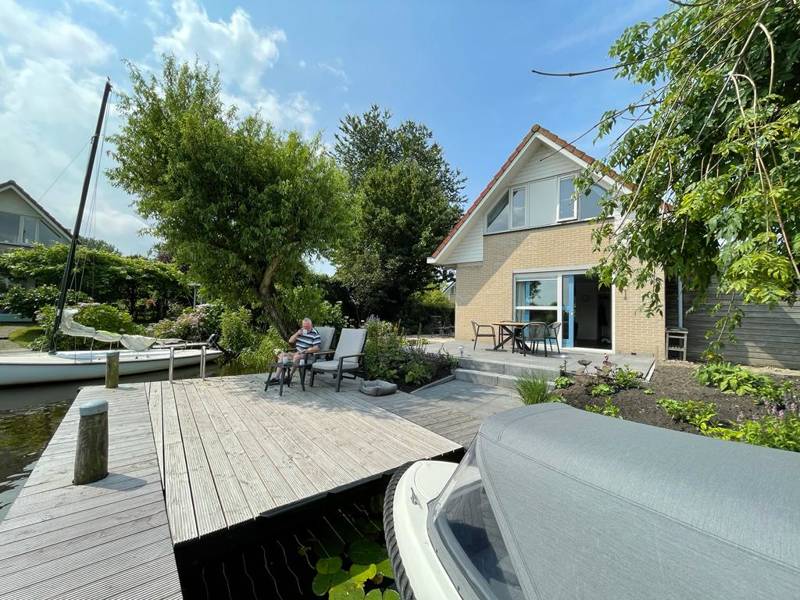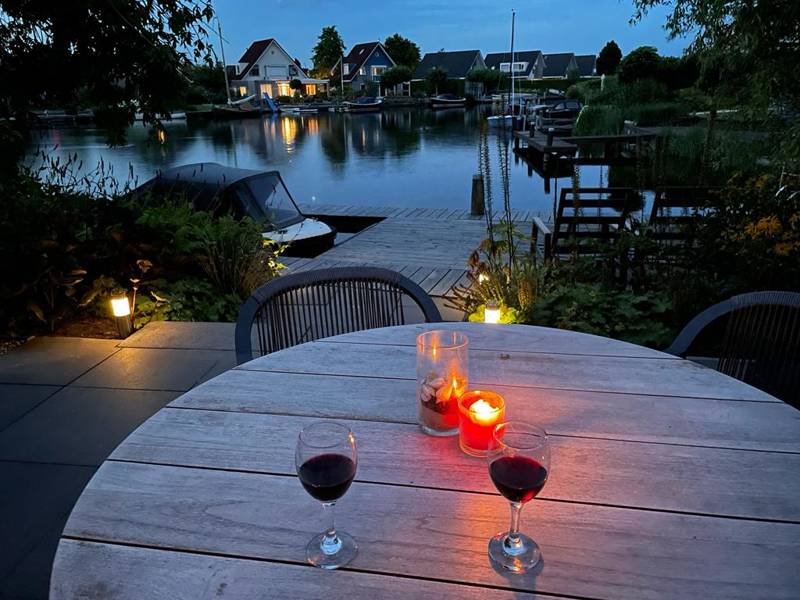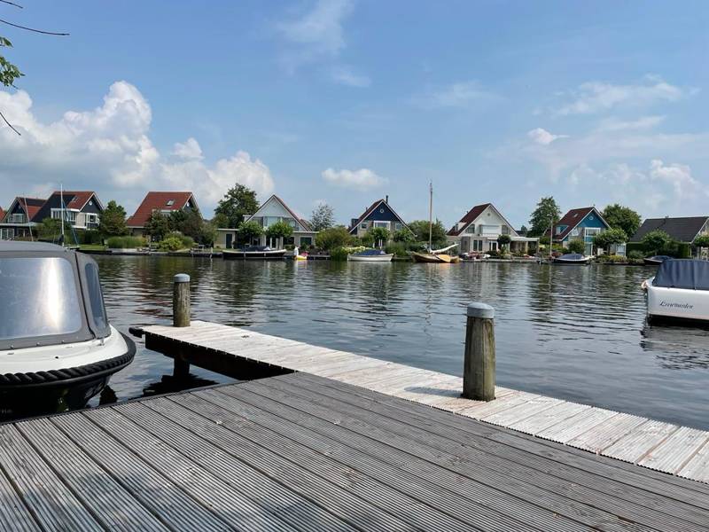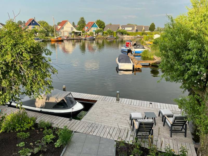 Buiten ervaar je het echte vakantiegevoel. De tuin is kind- en hondvriendelijk afgesloten en beschikt over twee stopcontacten, handig voor bijvoorbeeld het opladen van een fietsaccu of het aansluiten van verlichting. De ruime steiger van acht meter biedt plek voor het aanleggen van een boot en is voorzien van een zwemtrapje en een subplank met peddel, waarmee je direct het water op kunt.